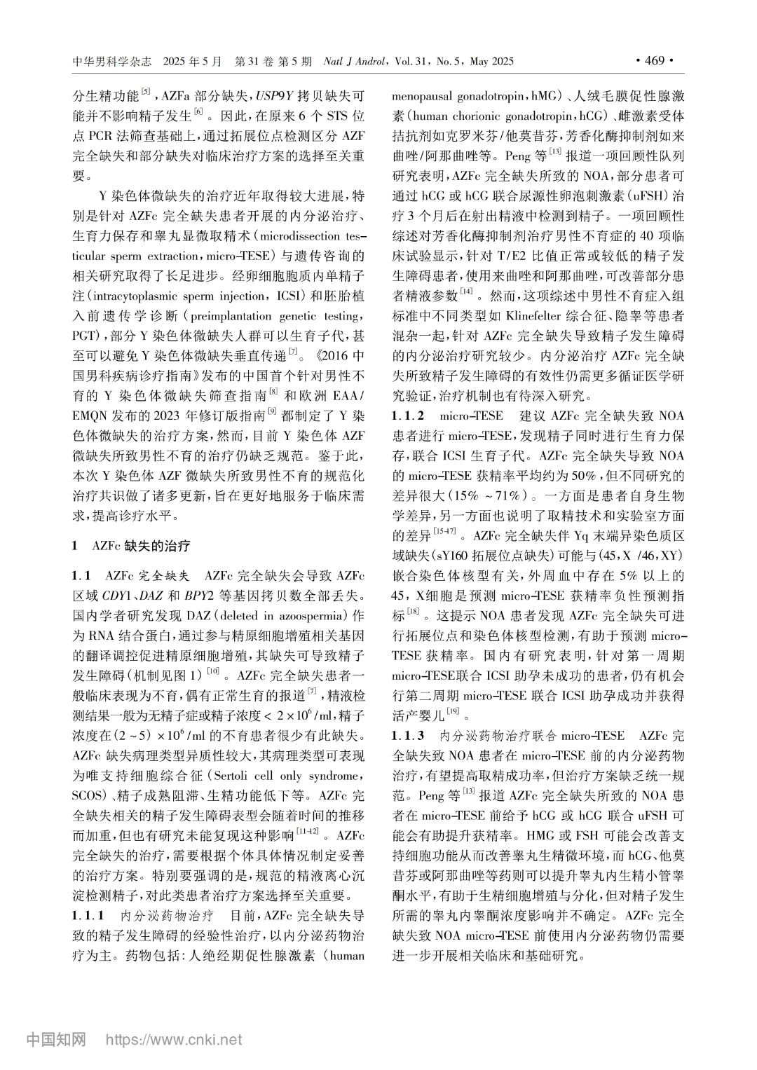 目前,AZFc完全缺失导致的精子发生障碍的经验性治疗,以内分泌药物治疗为主。药物包括:人绝经期促性腺激素(hMG)、人绒毛膜促性腺激素(hCG)、雌激素受体拮抗剂如克罗米芬/他莫昔芬,芳香化酶抑制剂如来曲唑/阿那曲唑等。内分泌治疗AZFc完全缺失所致精子发生障碍的有效性仍需更多循证医学研究验证,治疗机制也有待深入研究。